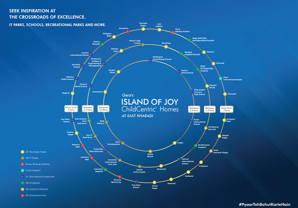 Gera’s Island of Joy in East Kharadi, Pune, is an extraordinary masterpiece by Gera Developments, redefining luxury living with its pioneering ChildCentric® Homes concept. Spread across a sprawling 12.5 acres, this landmark development features 9 iconic towers rising 30 to 32 storeys high and offers an impressive mix of over 1,800 thoughtfully designed residences, including elegant 2, 3, 3.5 BHK apartments and duplexes with carpet areas ranging from 676 to 1,830 sq.ft. Every inch of this development is meticulously curated to deliver an unparalleled living experience, blending world-class architecture with innovation, wellness, and recreation. Gera’s Island of Joy boasts an astounding collection of over 40 amenities, including three expansive clubhouses spread over 40,000 sq.ft. and more than 4 acres of open spaces, creating an unmatched lifestyle ecosystem where families thrive and children flourish. Designed for discerning homeowners who seek more than just a residence, this project promises a life of inspiration, vibrancy, and joy, where every detail has been elevated to perfection and every moment feels like a celebration of living.